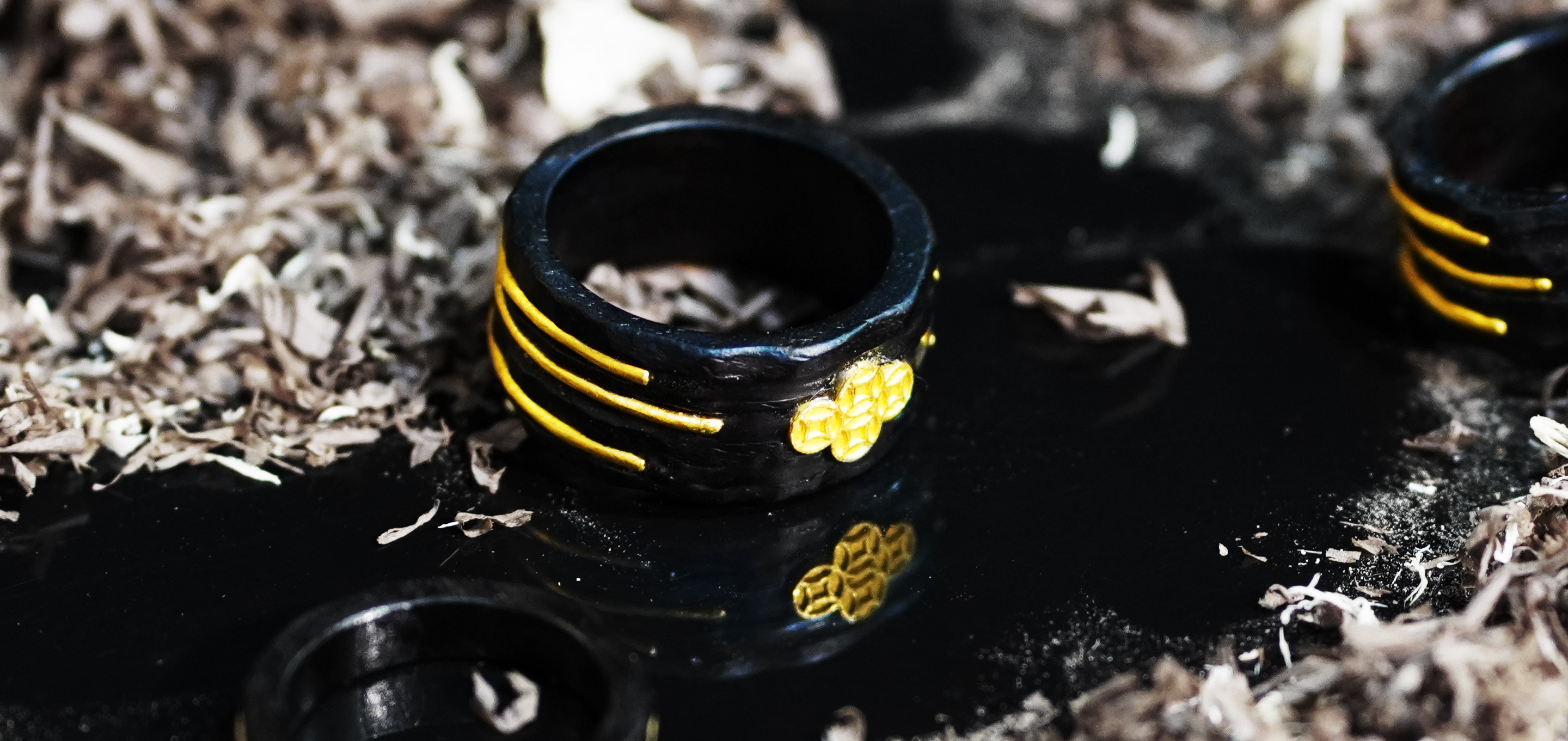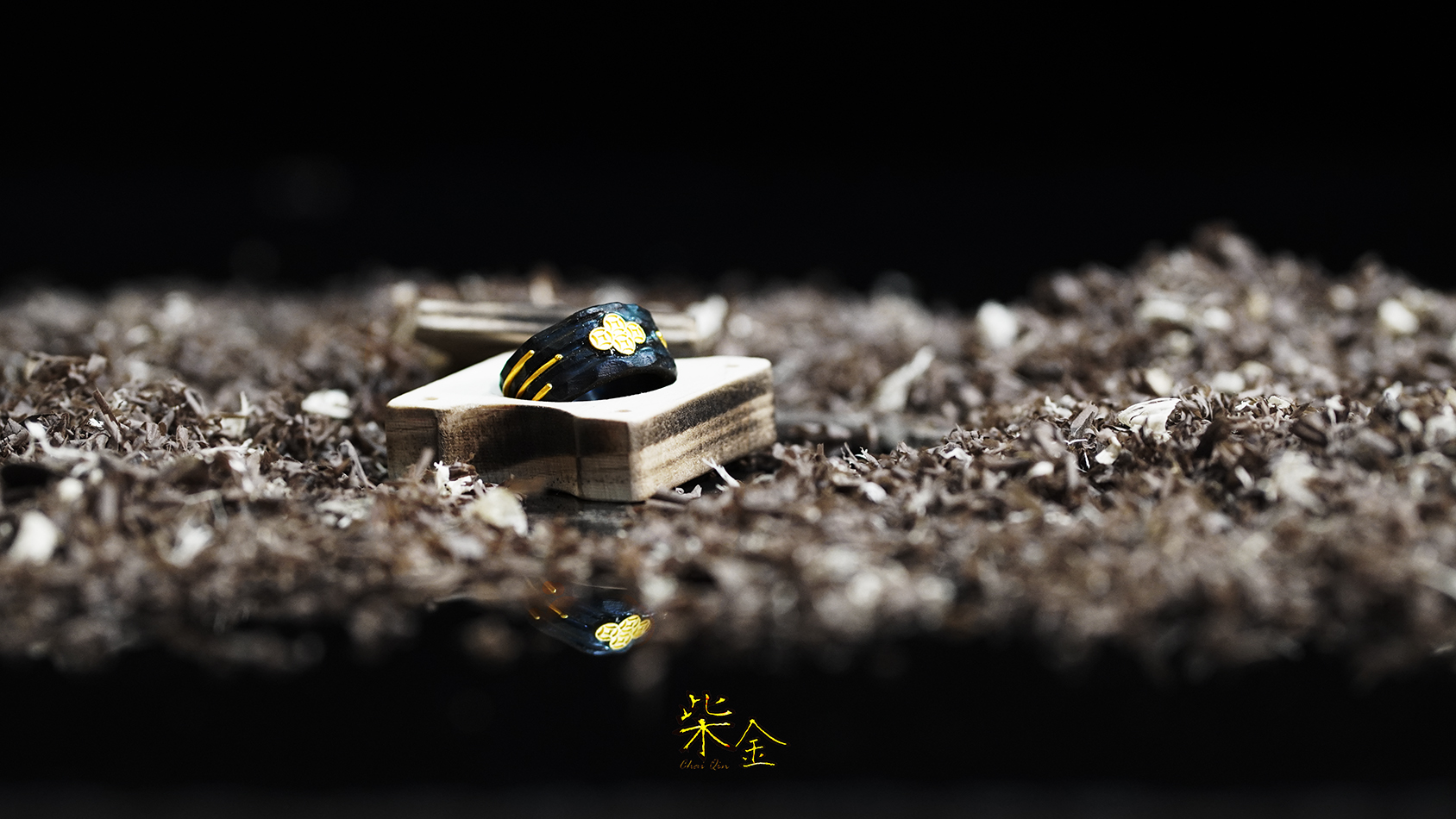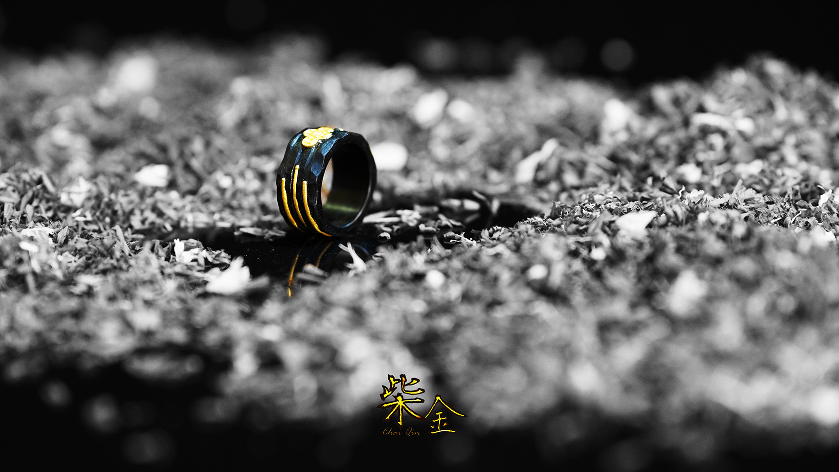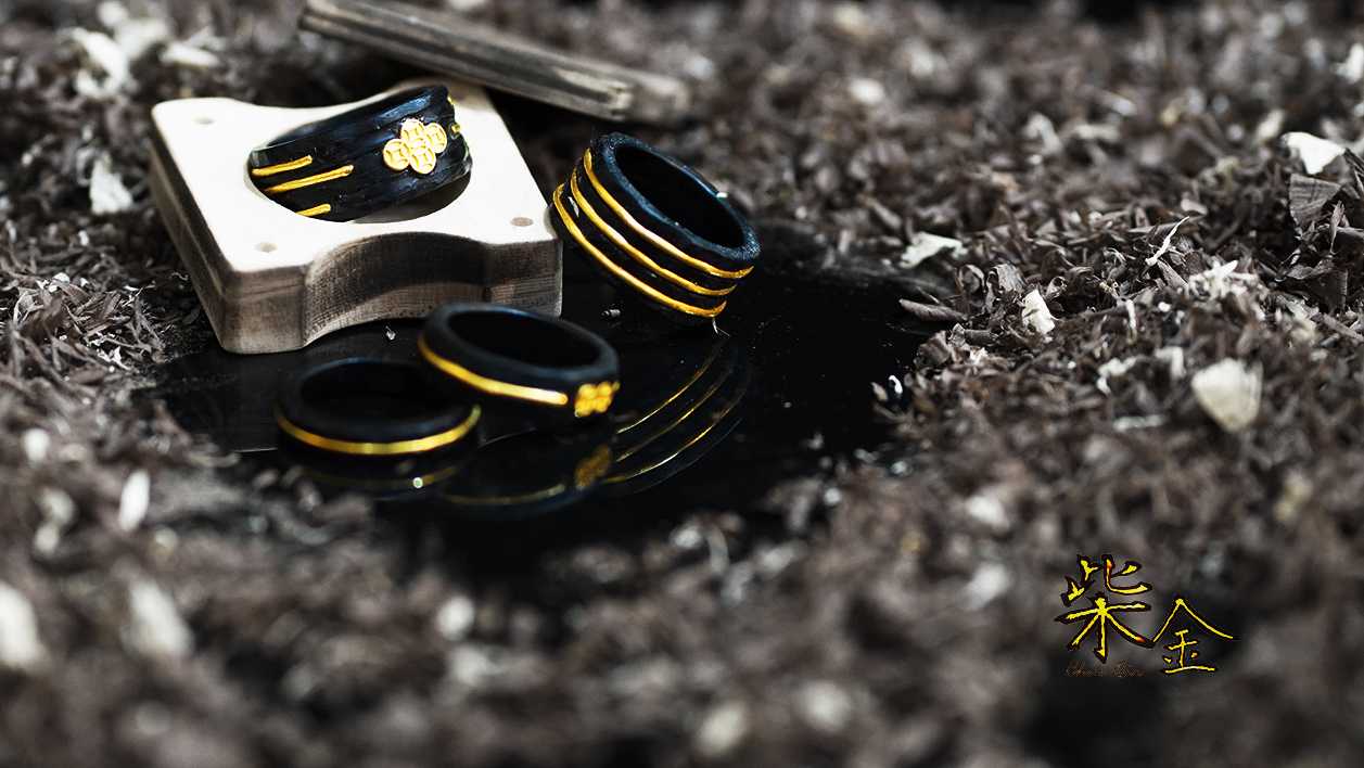 設計崎嶇不平的木戒面,開出溝槽再把黃金線黏崁入黑檀、紫光檀中,刻意不對稱的粗中細黃金線,呈現出(金流不息)的設計寓意。