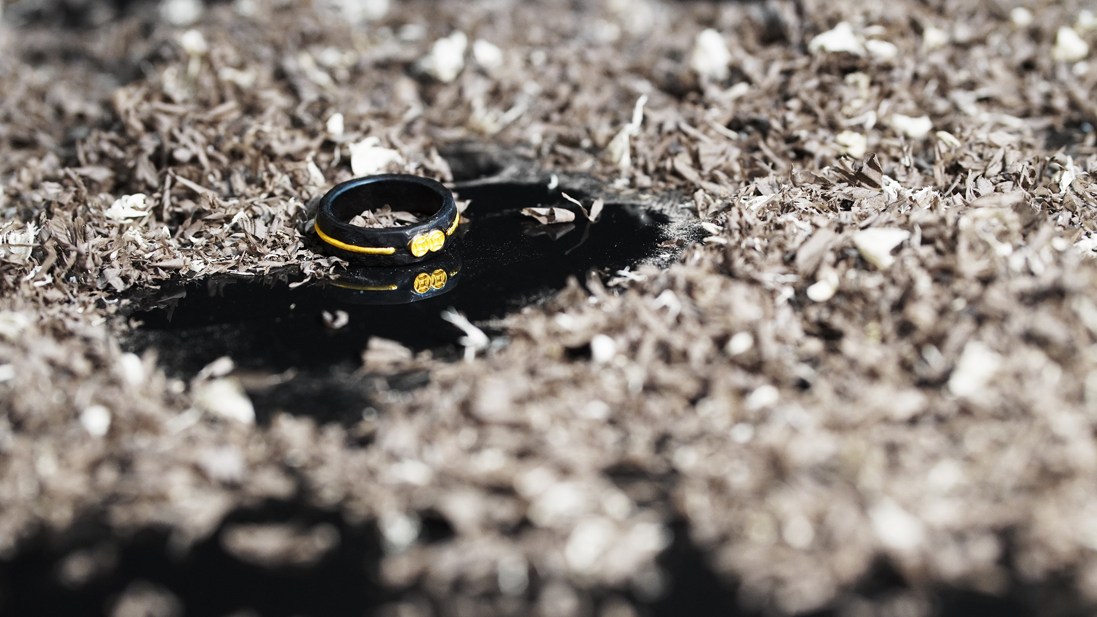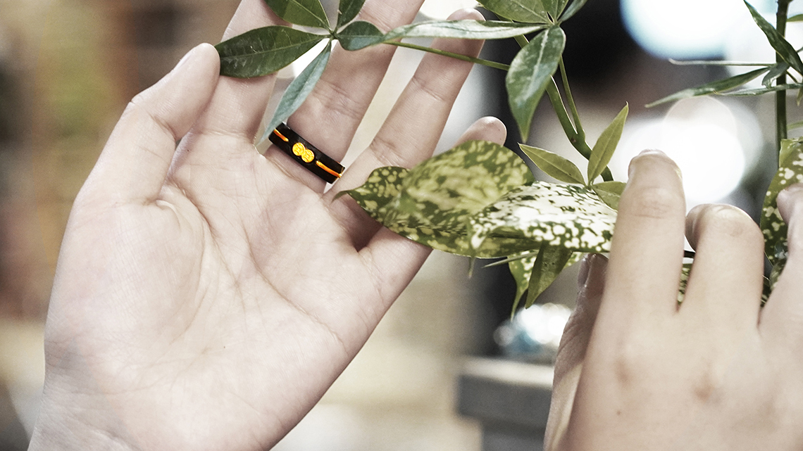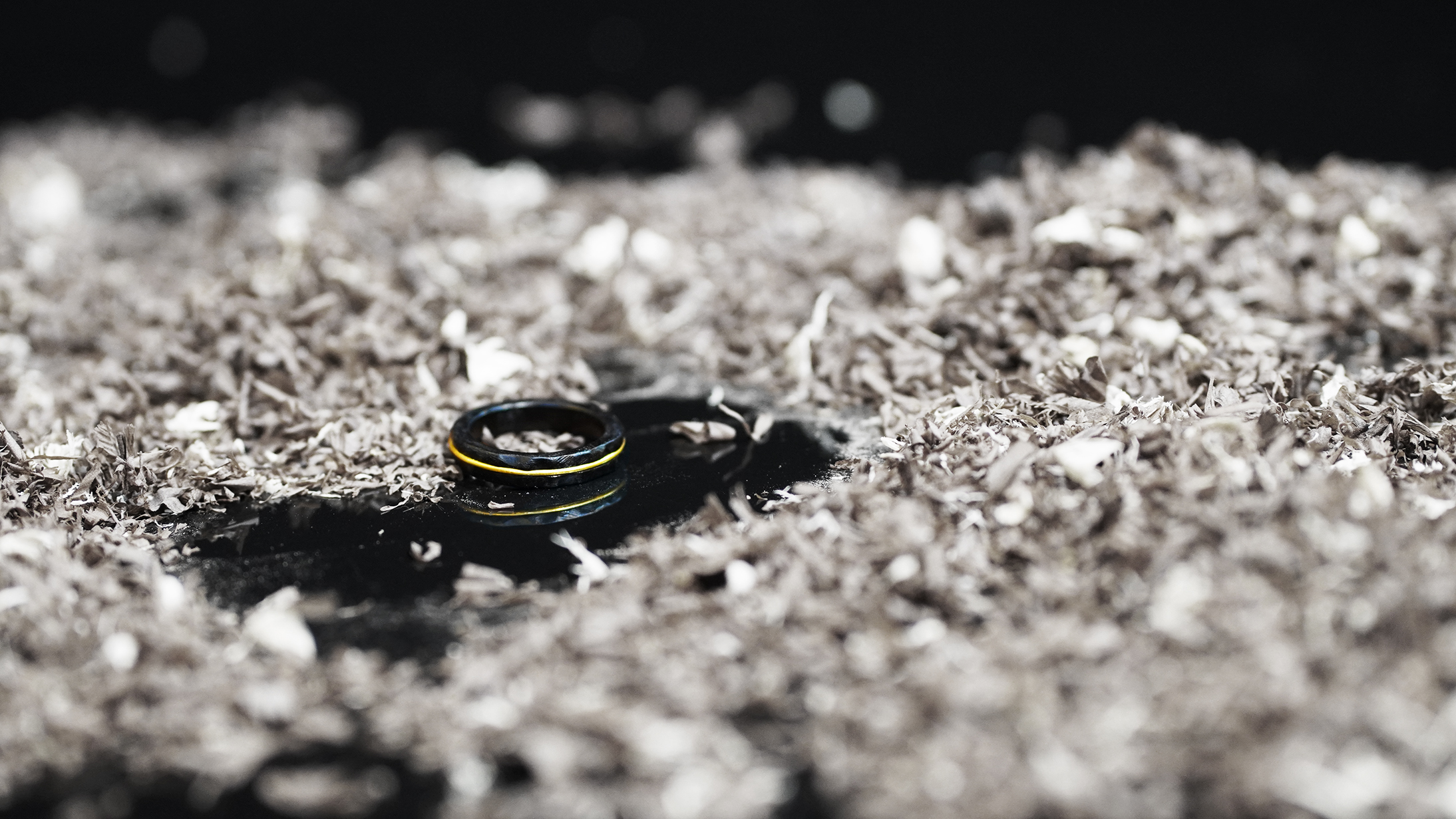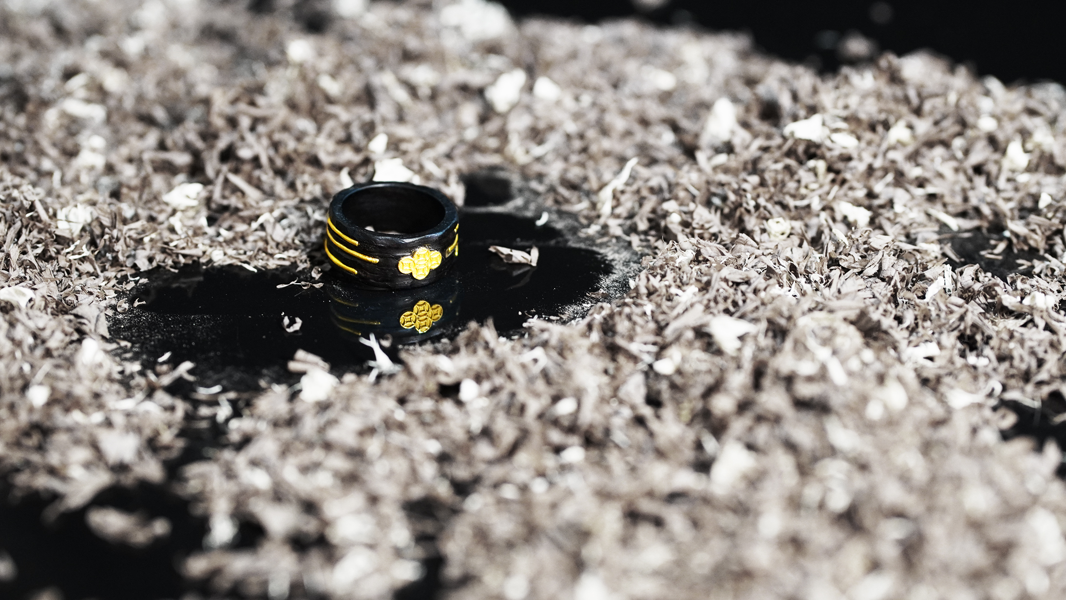 設計崎嶇不平的木戒面,開出溝槽再把黃金線黏崁入黑檀、紫光檀中,刻意不對稱的粗中細黃金線,呈現出(金流不息)的設計寓意。
